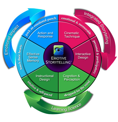 Emotive Storytelling creates content and orchestrates it to enable the mind to rapidly absorb, gist and retain the big picture as well as the detail. This also empowers the learner to choose their path which makes it even more personal. Emotive Storytelling combines the elements of integrated storytelling, learning science and emotional impact to deliver compelling stories online and to mobile devices. This unique fusion stimulates interest, accelerates understanding of both content and context, and drives a message deeper and faster than traditional learning and marketing approaches. |
