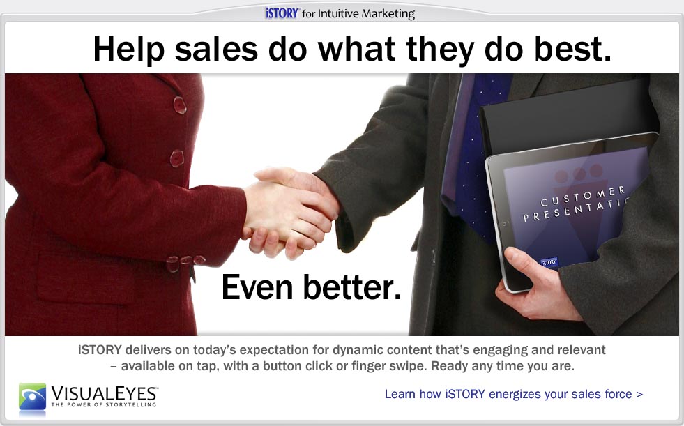 Scenario-based approaches are a powerful way to inspire people to model success or learn from valuable past lessons. iSTORY brings value as an ongoing and growing part of the organization's knowledge base in support of sales force training and leadership development. The end result is an understanding that drives positive action and productive behaviors in the field that grow customer relationships. iSTORY capability culminates in a shared, one-stop resource for global enterprise marketing, training, or education available to those that need it 24/7/365.